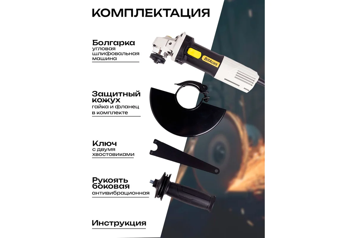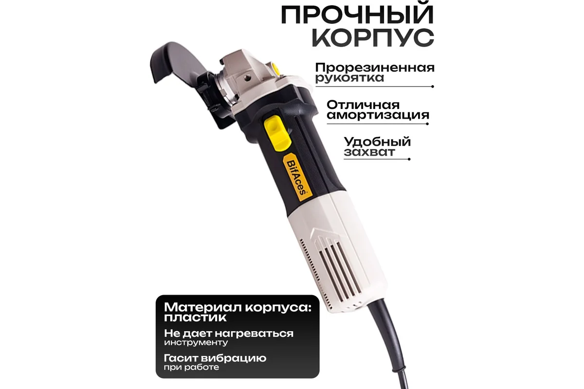 Угловая сетевая шлифмашина BifAces УШМ-AAG-1050, Щеточный двигатель, Напряжение 220В, Мощность 1050Вт, Скорость вращения от 3000 до 11000 об/мин, Диаметр диска 125мм, Наличие системы «плавного пуска», Регулировка частоты вращения, Защита от непреднамеренного пуска, Поддержание постоянных оборотов под нагрузкой, Защита от перегрузки, Отключение питания при заклинивании диска, широкая кнопка пуска с плавным ходом, Регулировка положения кожуха без инструмента, Длинна кабеля 2.0м. Комплектация — Угловая шлифовальная машина BifAces®, Антивибрационная боковая ручка, Разъёмный ключ с двумя хвостовиками, Гайка зажимная, Фланец опорный, Защитный кожух, Инструкция по эксплуатации, Картонная упаковка