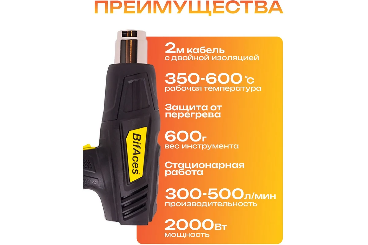 Фен строительный сетевой BifAces AHG-2000-2 Напряжение 220В, Мощность 2000Вт