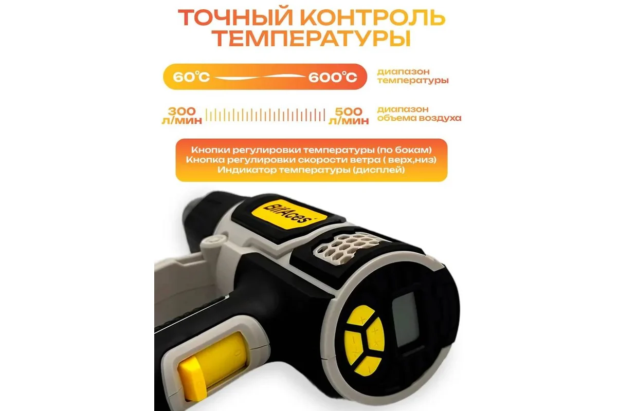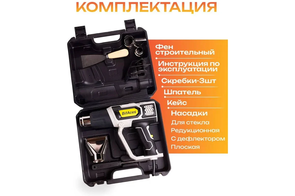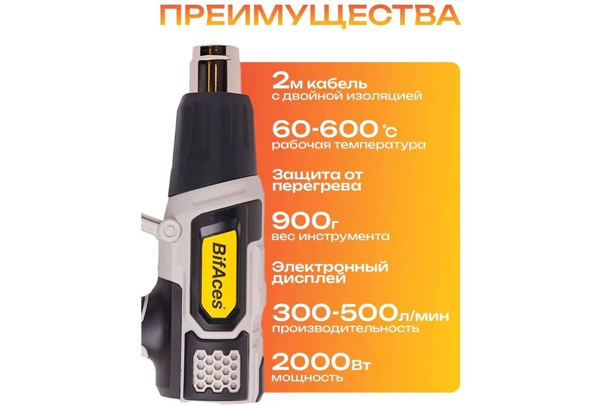 Фен строительный сетевой BifAces AHG-2000-D, Напряжение 220В, Мощность 2000Вт, Имеет ЖК дисплей с регулировкой скорости : 1-й режим — 60°С, 2-й режим плавный нагрев с 60~ 600°С градусов и 2 режима расхода воздуха Расход воздуха :500 л/мин и 300~500 л/мин, Легкость регулировки, более равномерный поток воздуха,Нагревательный элемент ускоряет нагрев и улучшает распределение тепла, при этом мощный и малошумный двигатель обеспечивает необходимый воздушного поток для оптимальной передачи тепловой энергии обрабатываемой поверхности, Корпус из специального твёрдого пластика надёжно противостоит повышенным механическим воздействиям. Длинна кабеля 1,8м, Комплектация — Фен строительный BifAces®, Плоская насадка, Насадка редукционная, Насадка для стекла, Насадка с дефлектором, Скребок, Шпатель, Инструкция по эксплуатации, Картонная упаковка, Кейс