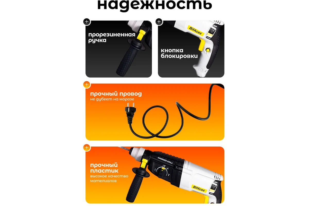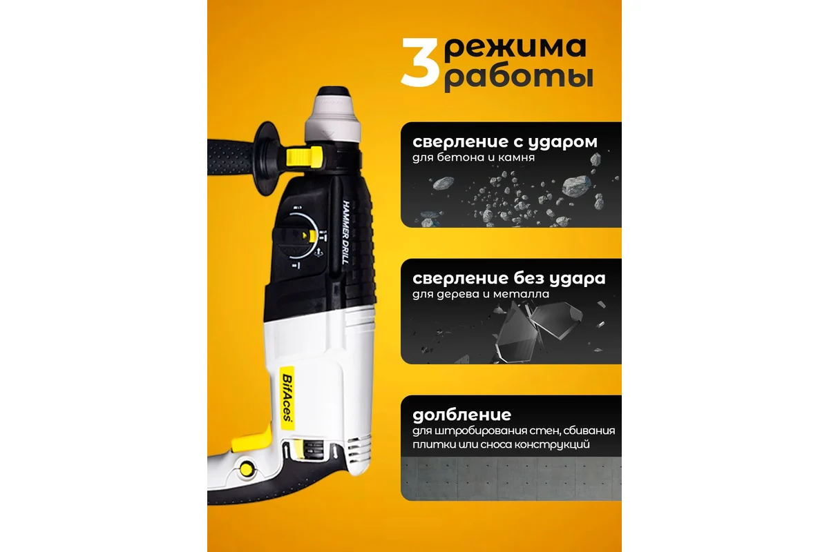 Электрический перфоратор BifAces ARH-800-26 — Напряжение 220В, Мощность: 800 ВТ, Скорость вращения 1150/мин, Частота ударов в минуту 5100уд/мин, Сила одиночного удара 2.6 Дж, Тип патрона SDS-plus, Есть 3 режима работы. Сверление / сверление с ударом / удар, предназначен для сверления отверстий в различных материалах (дерево, сталь, бетон, кирпич и т. д.). Есть режим направление вращения вала — по часовой стрелке или против, Есть ограничитель для глубины бурения. Есть дополнительная рукоятка. Есть функции Фиксация кнопки выключателя, Длинна кабеля 2,0м, Комплектация — Электрический перфоратор BifAces® Ограничитель глубины сверления, Рукоятка дополнительная, Инструкция по эксплуатации, Картонная упаковка, Кейс