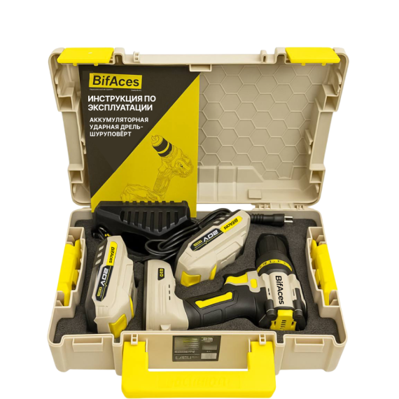 Аккумуляторная ударная дрель-шуруповерт BifAces DLID-20 с батареей Li-Ion 20 В и максимальным крутящим моментом в 70 Н·м, предназначена для монтажа и демонтажа резьбовых соединений, сверления отверстий в металле, древесине, пластмассе и других материалах.
