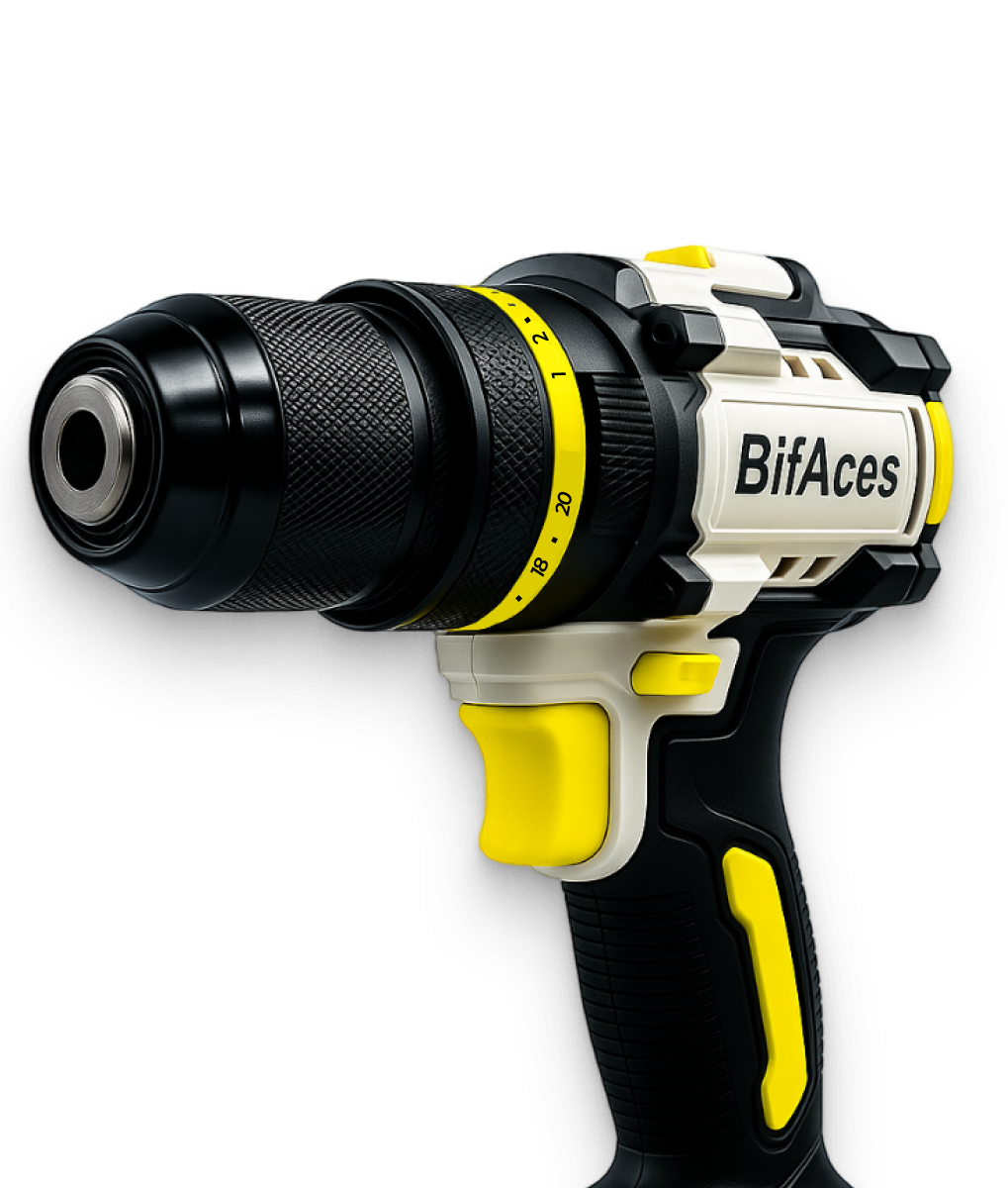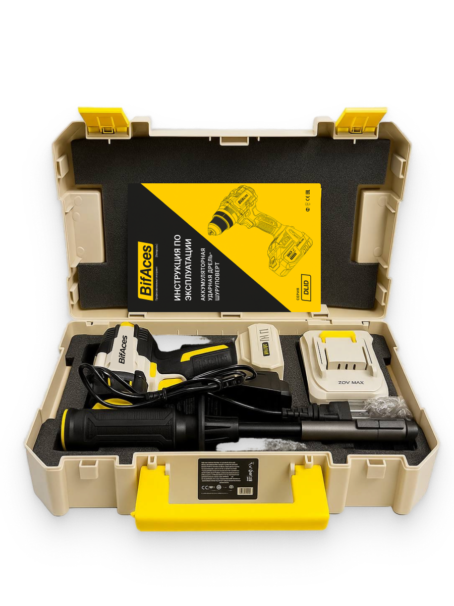 Аккумуляторная ударная дрель-шуруповерт BifAces DLID-40 с батареей Li-Ion 20 В и максимальным крутящим моментом в 160 Н·м, предназначена для монтажа и демонтажа резьбовых соединений, сверления отверстий в металле, древесине, пластмассе и других материалах.