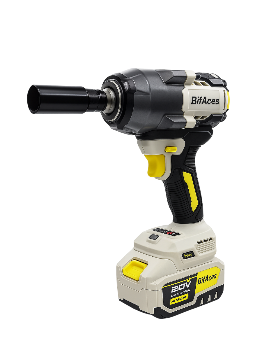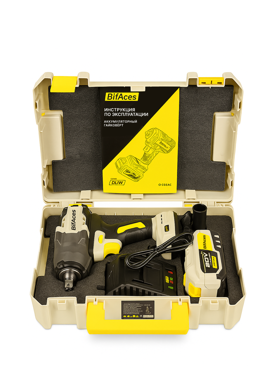 дарный аккумуляторный гайковерт BifAces DLIW-40-1000 с батареей Li-Ion 20 В ёмкостью 4,0 А·ч(аккумуляторная платформа Makita) и бесщеточным двигателем, развивает крутящий момент до 1000 Нм, имеет регулировку скорости, где максимальная скорость вращения до 2000 об/мин с частотой до 2200 уд/мин.