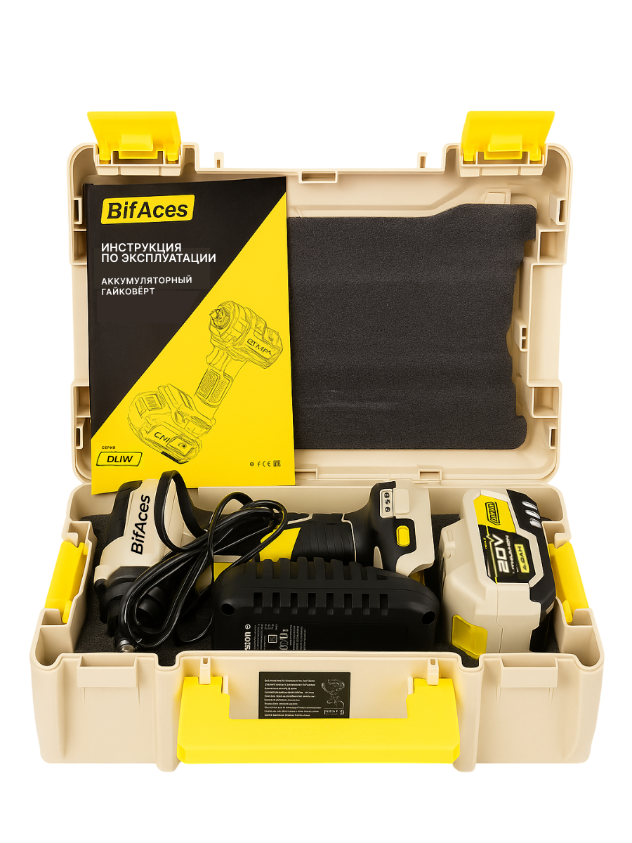 Ударный аккумуляторный гайковерт BifAces DLIW-40-600 с батареей Li-Ion 20 В ёмкостью 4,0 А·ч (аккумуляторная платформа Makita) и бесщеточным двигателем, развивает крутящий момент до 600 Н·м, имеет регулировку скорости, где максимальная скорость вращения до 2300 об/мин с частотой до 3500 уд/мин.