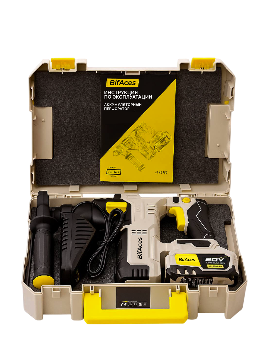 Аккумуляторный перфоратор BifAces DLRH-40-24 с бесщёточным двигателем и аккумулятором Li-Ion емкостью 4 А·ч(аккумуляторная платформа Makita), с напряжением 20 В и патроном SDS-plus, предназначен для сверления отверстий в различных материалах, а также для штробления стен, разрушения кирпичной кладки.