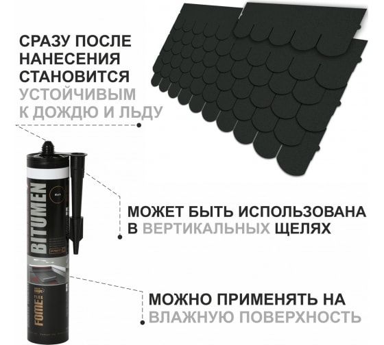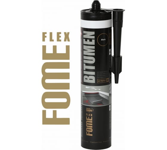 Битумный герметик FOME FLEX Bitumen (черный; 300 мл) 01-4-2-008 используют для заделки швов между листами кровли, быстрой герметизации и склеивания поверхностей во время ремонта или монтажа водосточных, дренажных систем и вентиляционных шахт.