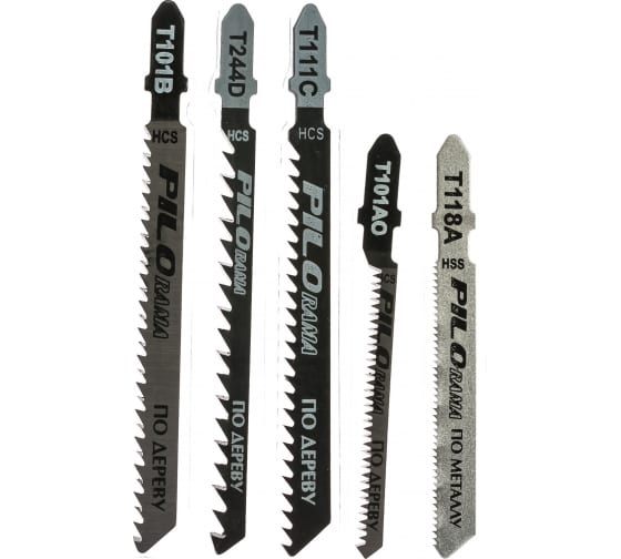 Pilorama 560005 включает самые популярные модели пилок для электролобзика для чистого, быстрого, грубого и фигурного распила древесины и пилку для пиления металла.
