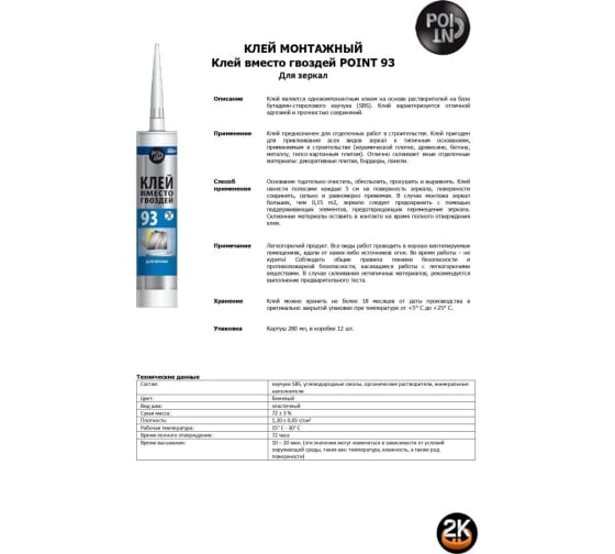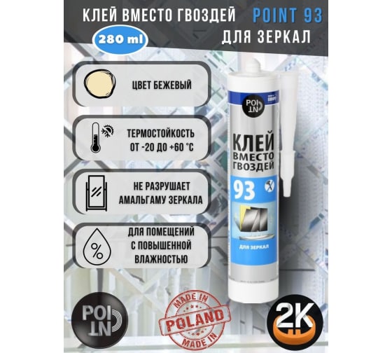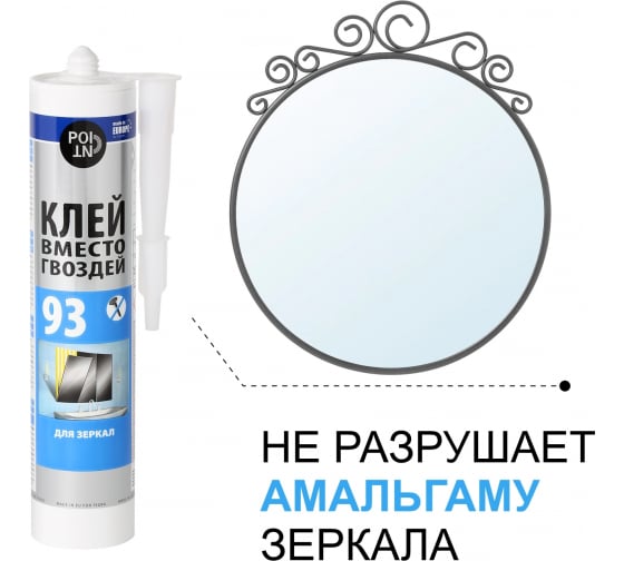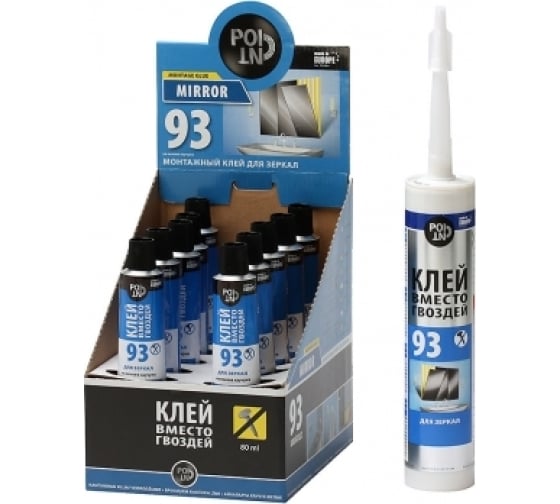 Клей вместо гвоздей POINT 93, для зеркал, 280 мл 03-1-0-093 используют во время монтажных и отделочных работ для приклеивания всех видов зеркал, декоративной плитки, бордюров и панелей.
