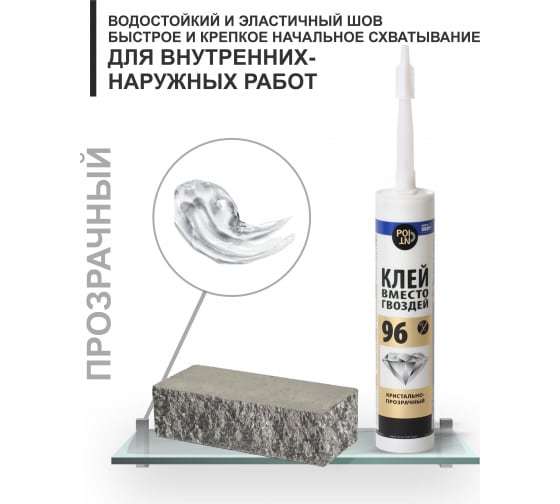 Клей вместо гвоздей 96 POINT (кристально прозрачный; 280 мл) используют во время монтажных и отделочных работ для приклеивания реек, панелей и досок из жесткого ПВХ и древесины, кессонов, розеток и карнизов из полиуретана.