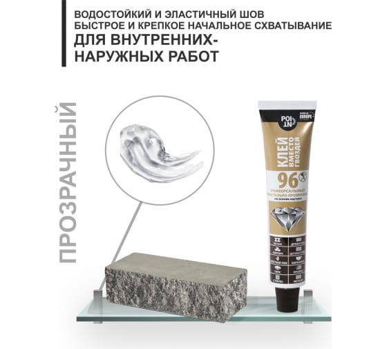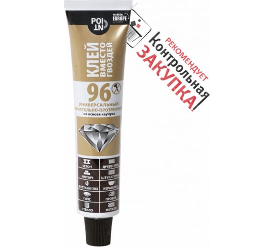 Клей вместо гвоздей POINT 96, кристально-прозрачный, в шоу-боксе, 80 мл 03-1-0-196 используют во время монтажных и отделочных работ для приклеивания реек, панелей и досок из жесткого ПВХ и древесины, кессонов, розеток и карнизов из полиуретана.