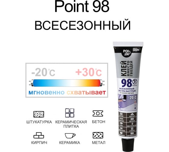 Клей вместо гвоздей POINT на основе каучука 98 Glue POINT в шоу-боксе, 80 мл 03-1-0-198 используют во время монтажных и отделочных работ для приклеивания плинтусов, цоколей, порогов, панелей, керамической плитки, для склеивания декоративных элементов.